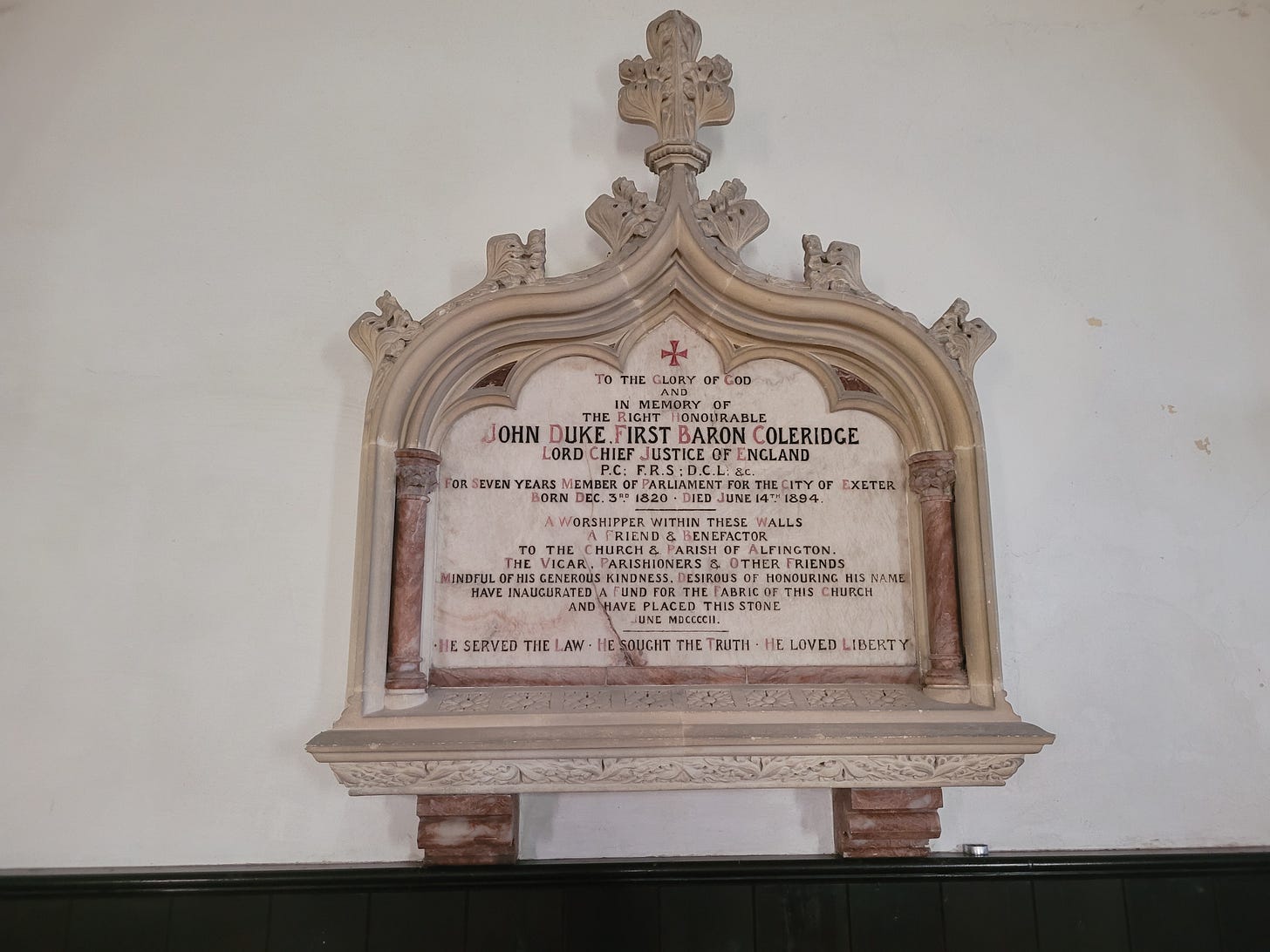 The Coleridges were an important family in the area, and indeed England: many gravestones in the churchyard bear the same name; the celebrated poet Samuel Taylor Coleridge (Fr Coleridge’s great-uncle) was also from the same town; the priest’s older brother, John Duke Coleridge, later became the Lord Chief Justice of England.