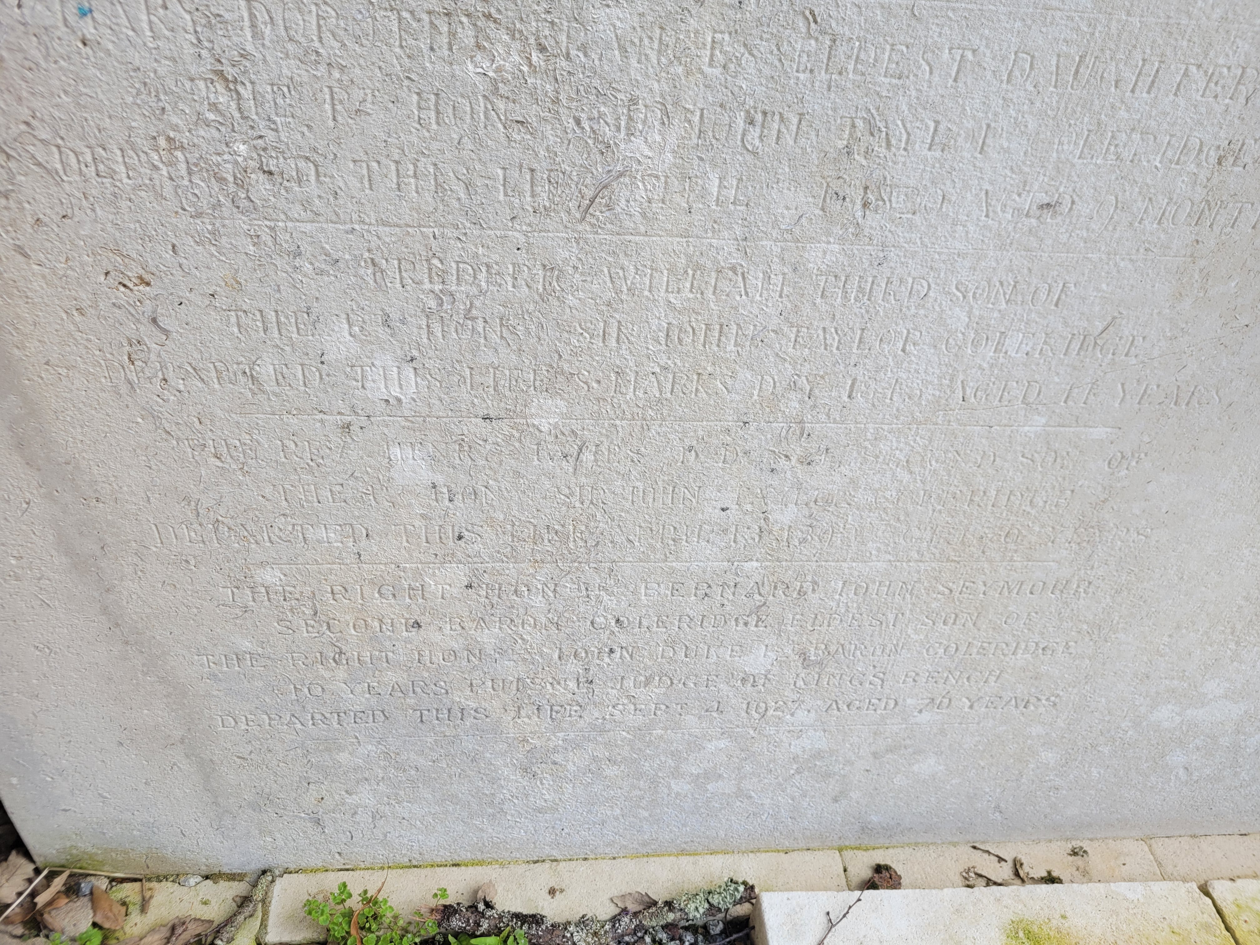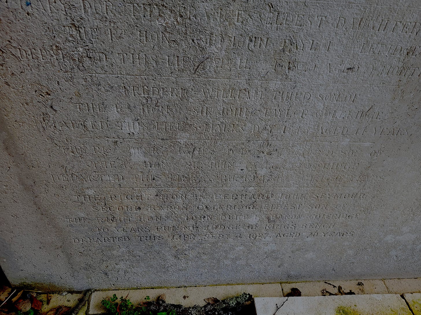 I took a closer look. I could make out parts of it, just as “REV HENRY ~~~ES” – no “COLERIDGE” after them, but the other names on the monument were set in the same way. As I looked harder I could see “SECOND SON”, “SIR JOHN TAYLOR COLERIDGE”, “DEPARTED”, AND “~PRIL 13 18~3”.