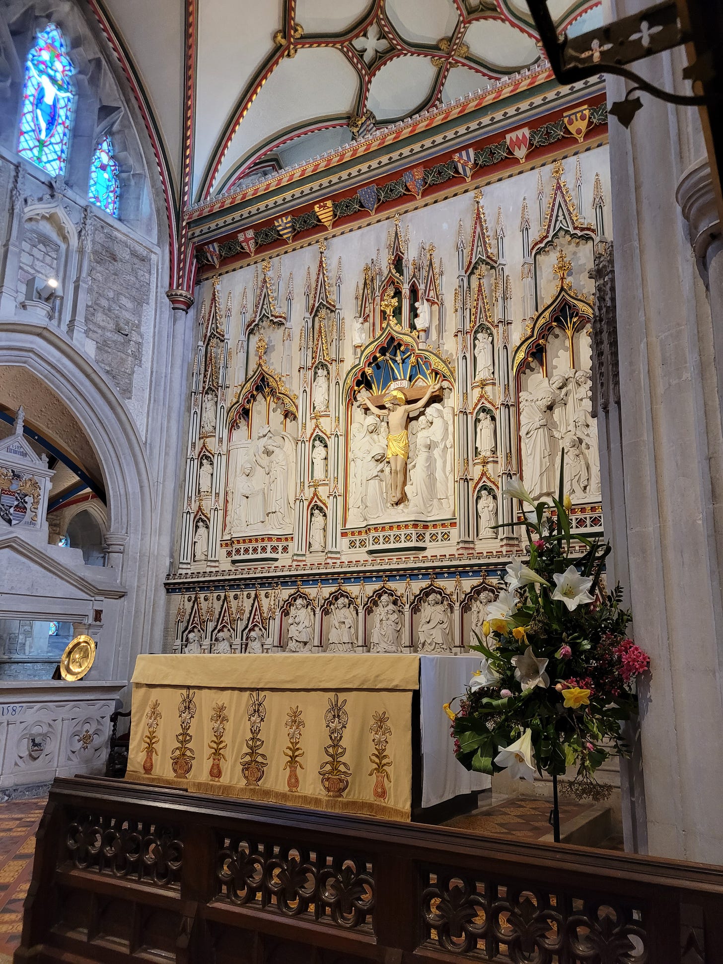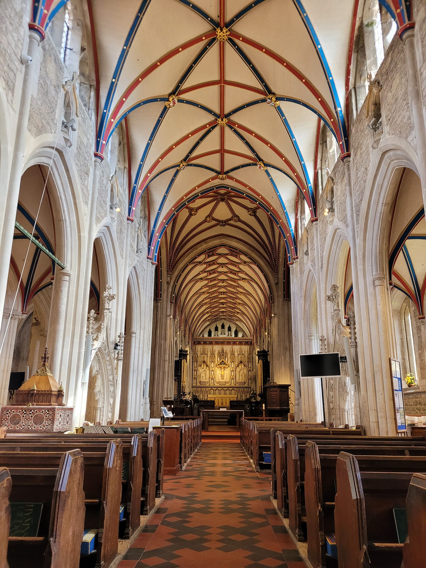 Unfortunately, the parish church was full of children’s toys, both in a large play area and even at the front of the sanctuary. It is understandable that people want to make churches welcoming to children, but it detracted a lot from the magnificence in the pictures of above.