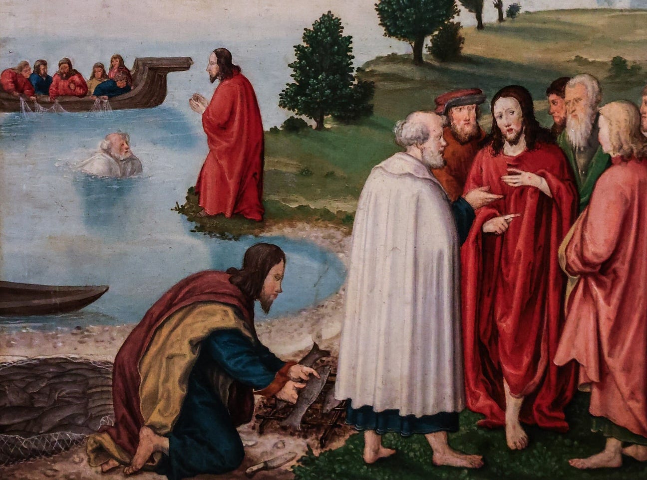 In the dawn of the morning our Lord was on the shore near them, but they did not know Him. He asked them if they had any food, and when they answered No, He bade them cast their net on the right side of the boat. The net was filled with fishes. St. John had already discerned our Lord, and told St. Peter Who it was. St. Peter leapt into the sea in his short tunic, and made for the land. The others followed in the boat, dragging the net. They found our Lord, with a fire of coals burning, a fish upon it, and some bread.